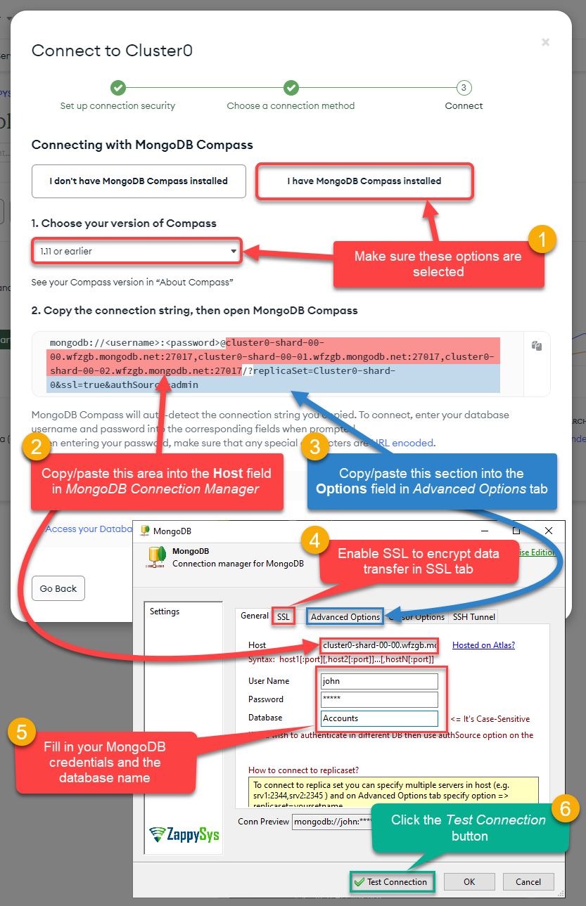 - Then proceed by simply copying and pasting the configuration information into the MongoDB Connection Manager we left to rest for a while. Move on by filling in your database credentials and the database you are connecting to. Also, don’t forget to enable SSL. Just patiently follow the numbers in orange circles below and you will be done faster than you think!