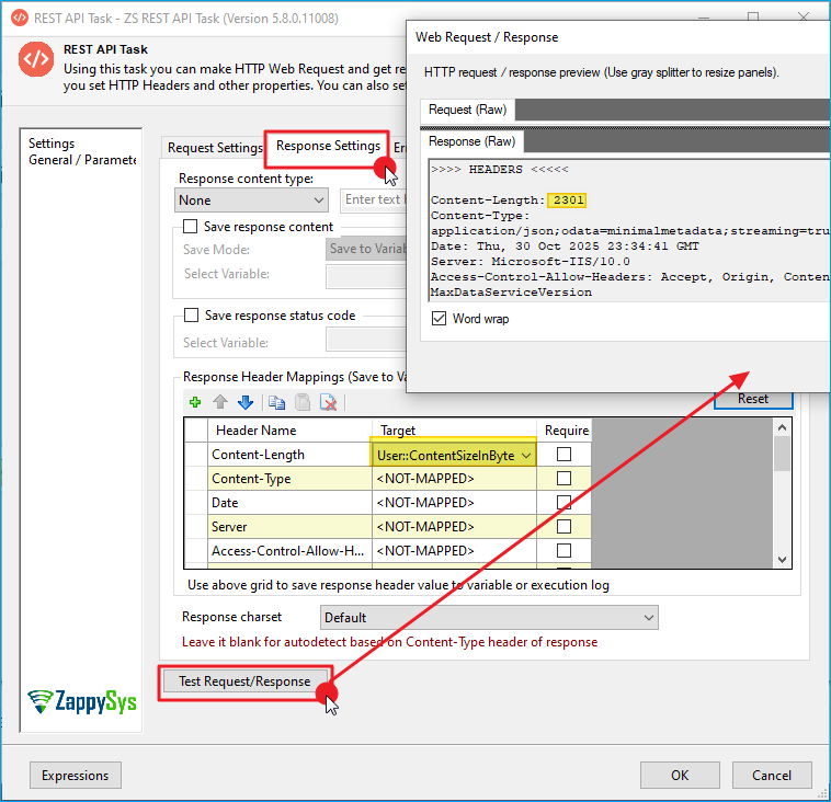 - Now go to the Response Settings tab as below and Configure the Content-Length Header mapping. If it’s not showing in the Grid, most likely your Web Server doesn’t support the HEAD command, and you may need to use another method. For now, we will assume that just like most Web Servers, your API also supports the HEAD command.