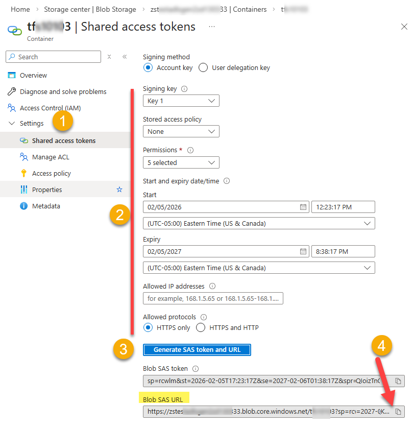 Recommended: Use SAS URL for quicker and more reliable configuration. While SAS Token authentication is still supported, Copy SAS URL is easier and more user-friendly because it already includes the container path. When you paste the SAS URL into the Connection UI, the container name is automatically detected, eliminating the need to enter it as a separate step manually.