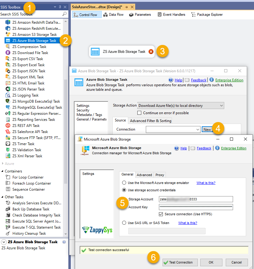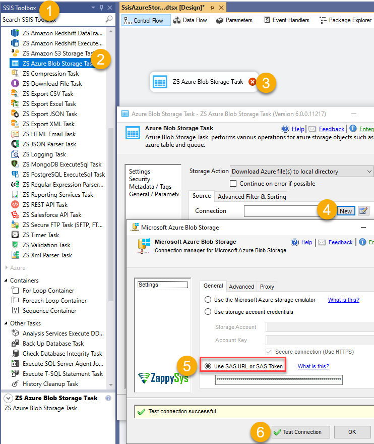 5. Create or open an SSIS project in Visual Studio and add the ZappySys Azure Storage Task.
