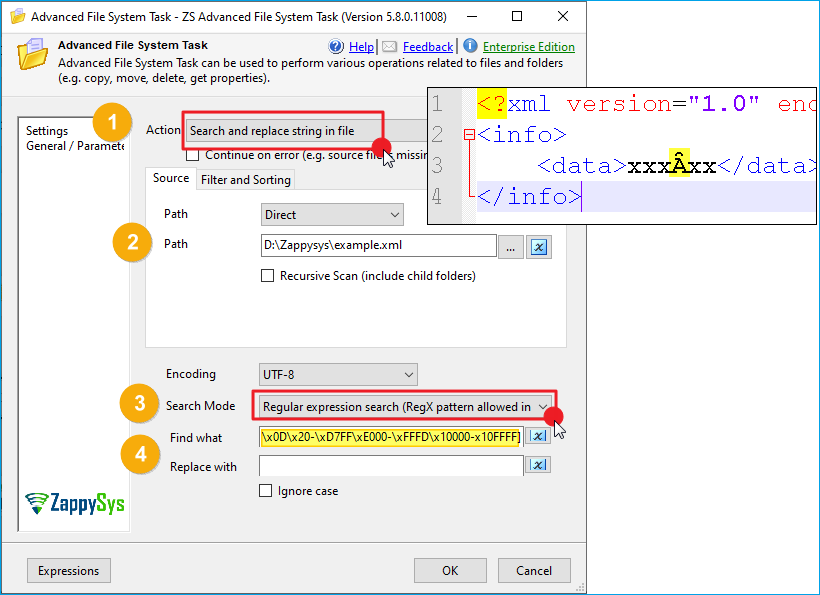 SSIS Advanced File System Task – Search and Replace Option -Remove invalid XML characters using Regex (Regular Expression)