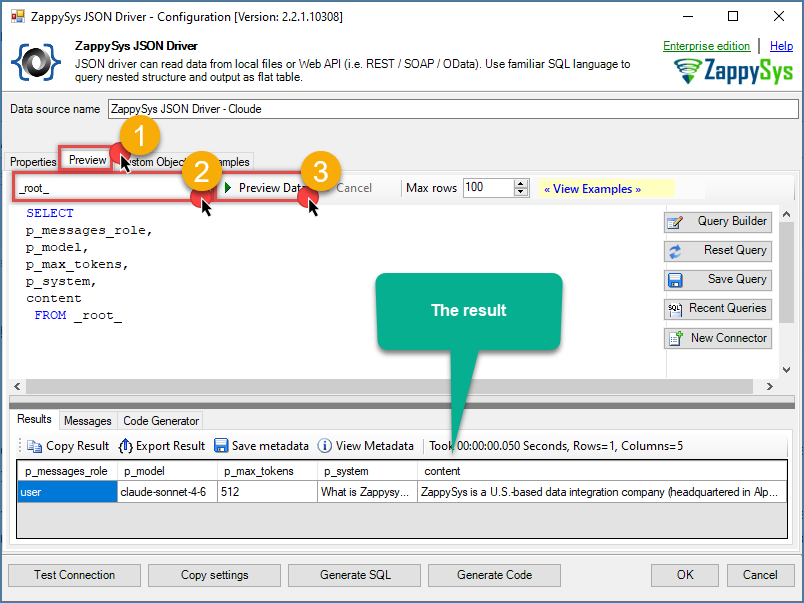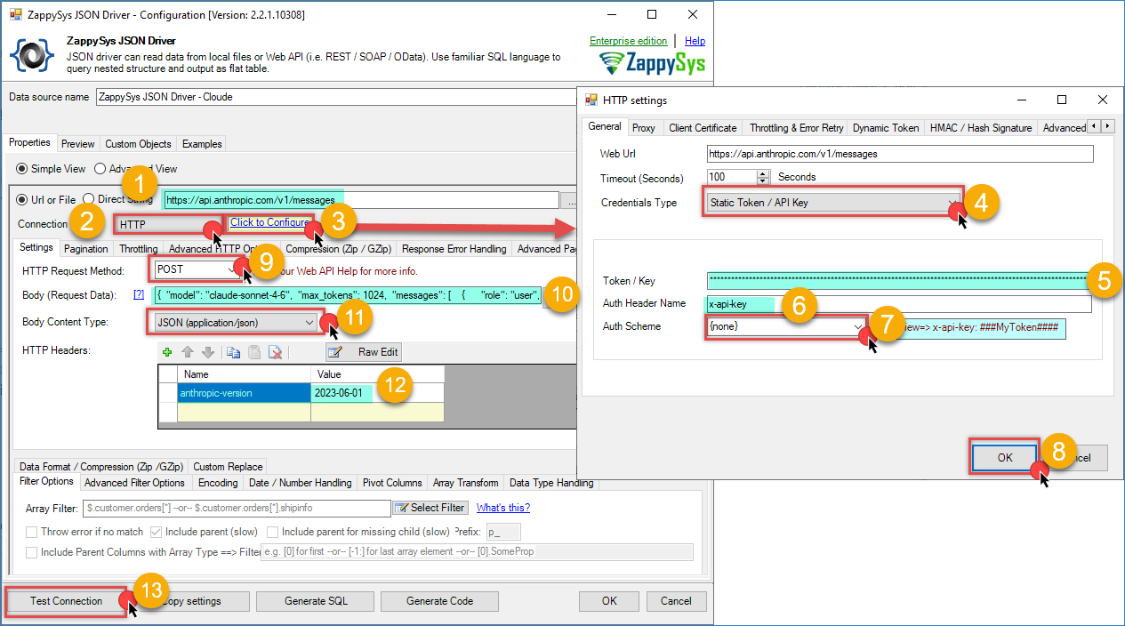 Claude.IA is a powerful cloud-native intelligence and automation platform that offers REST APIs for accessing AI models, data processing pipelines, and automation workflows. In this guide, we will demonstrate how to connect to Claude using the Zappysys ODBC Driver for REST APIs with API key authentication.