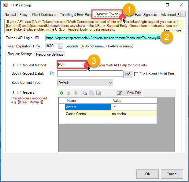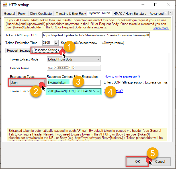 11. In Token Function, use the following function. The Authorization header must contain the Company ID( Enter your Tripletex company ID or use 0 if unknown) and Session Token in Base64-encoded format: <<0:[$token$],FUN_BASE64ENC>>