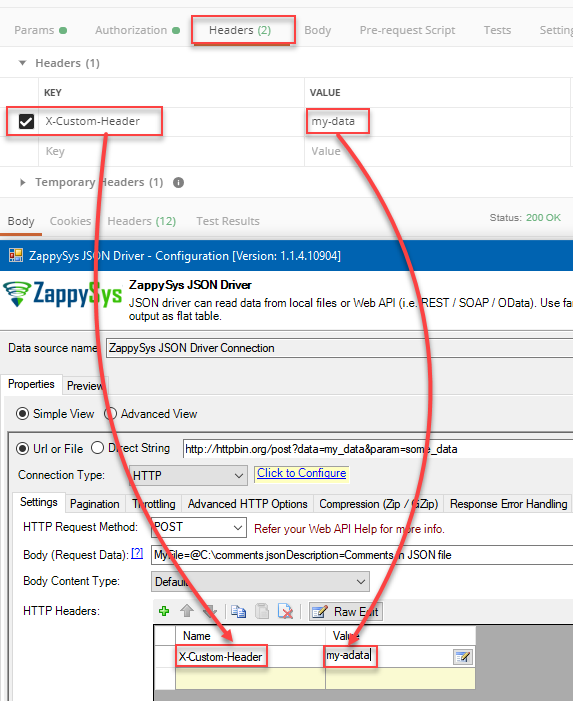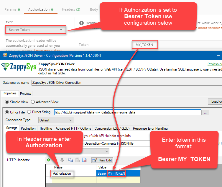 When you are connecting to an API you may have examples of how to do that in Postman. If you know how to do it in Postman, you are one step away from making it work in SSIS PowerPack and ODBC PowerPack (JSON, XML, CSV Drivers, and other). Most of the examples will show how to do that specifically using ODBC PowerPack and JSON Driver, but since ODBC PowerPack UI is very similar to the connectors of SSIS PowerPack, it will be quite clear where to use it in SSIS PowerPack as well. In the examples where UI differs significantly, both – ODBC and SSIS PowerPack – examples will be presented.
