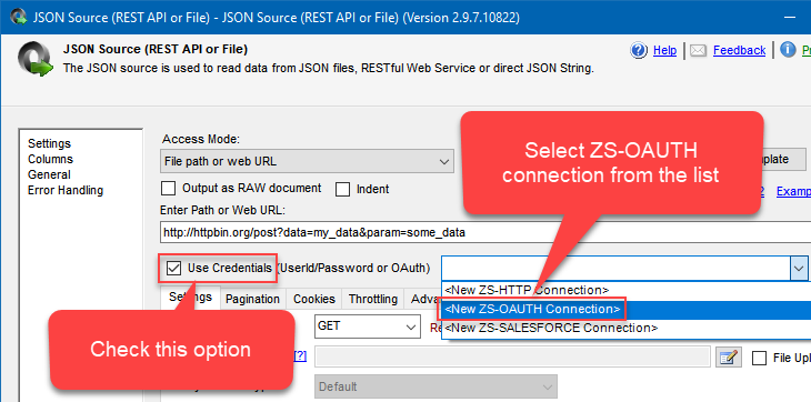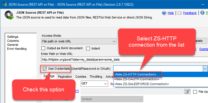 In SSIS PowerPack use the same configuration as above, just create ZS-HTTP Connection Manager using instructions below: