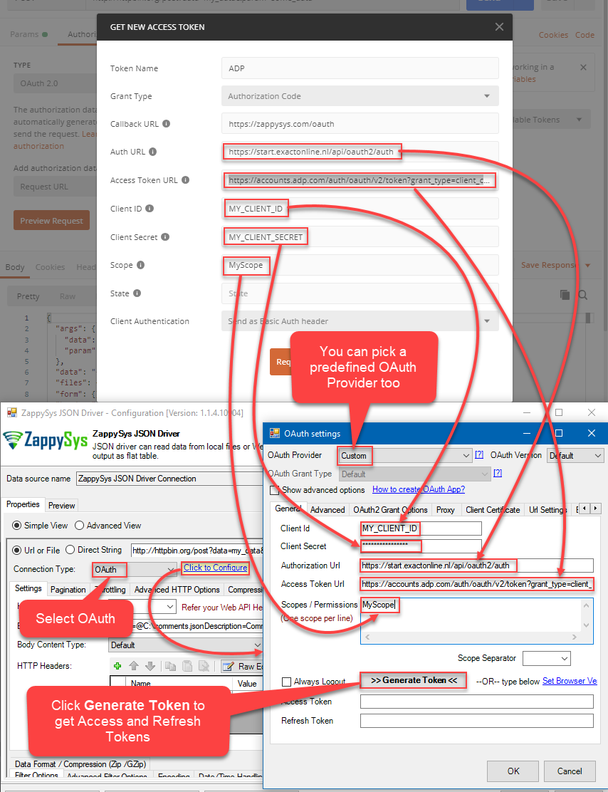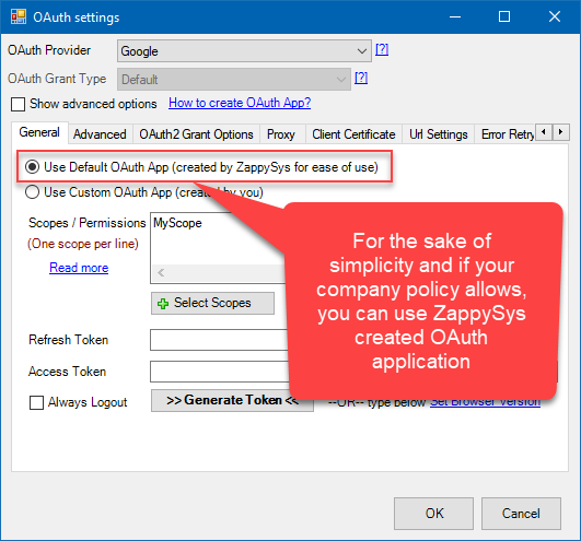 For simplicity and if your company policy allows it or at least for testing purposes, you can use a Default OAuth Application created by ZappySys: