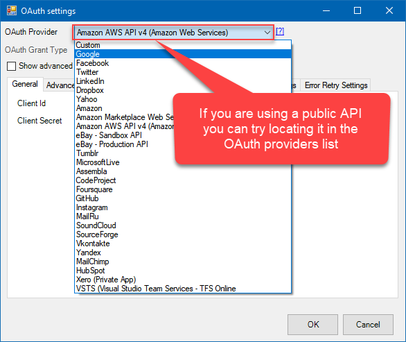 If you are using a known, public API service, you may try locating it in the OAuth Providers list, which will save you from configuring Authorization and Access Token URLs: