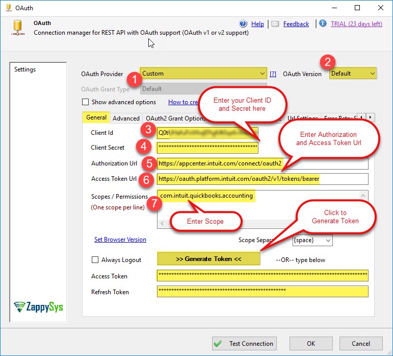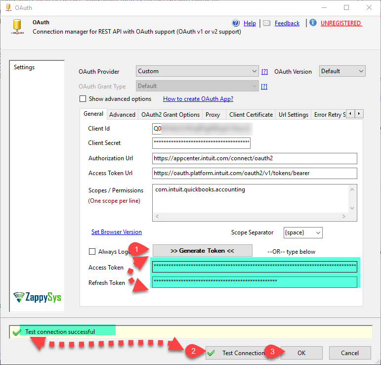 - Click on Generate Token button to Generate token and then click on Test Connection button and click on OK to save the connection manager configurations settings.