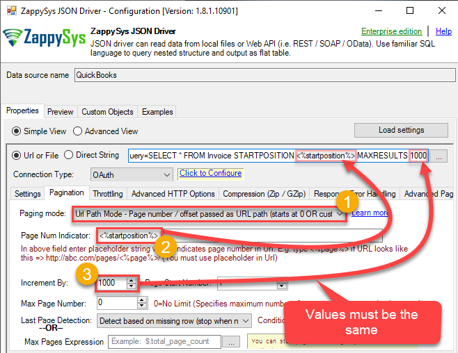 1https://sandbox-quickbooks.api.intuit.com/v3/company/193514799372394/query?query=SELECT * FROM Invoice STARTPOSITION <%startposition%> MAXRESULTS 1000 - Configure the new OAuth Connection for QuickBooks Online as below.