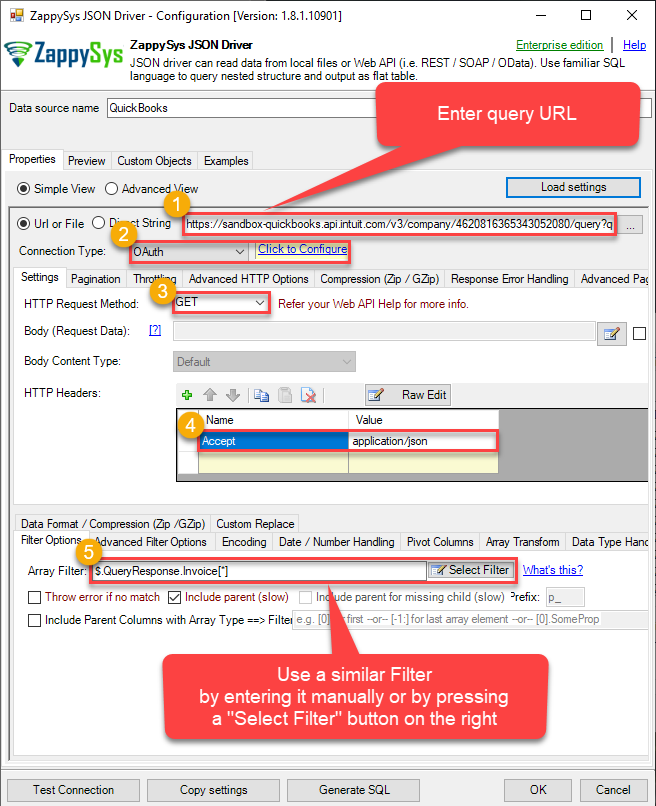 - Now it’s time to connect with QuickBooks. Let’s use JSON Driver Data source with the following URL: