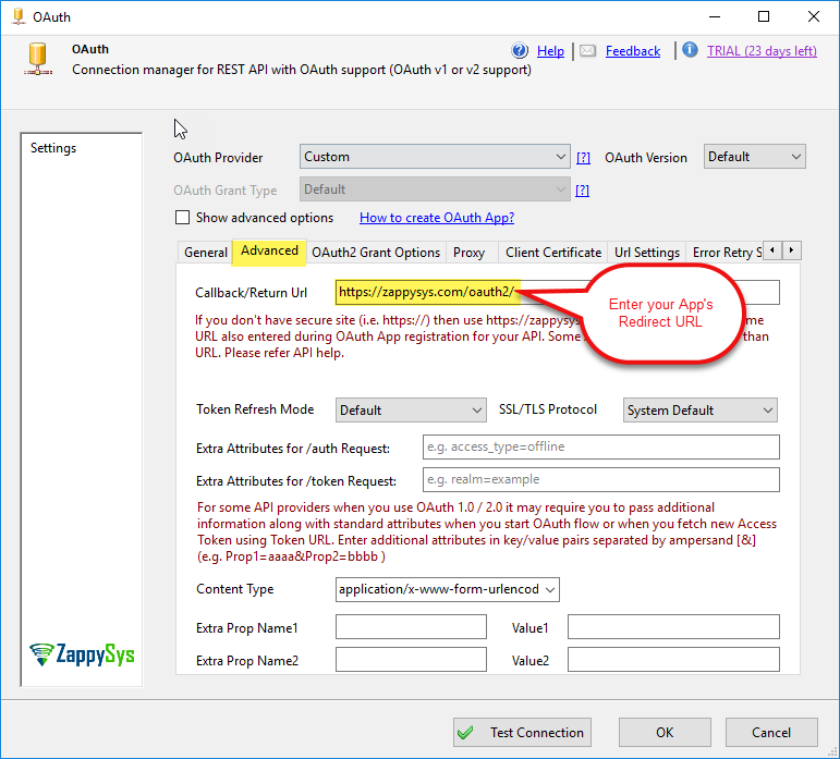 Basically, you need to configure the configurations of App on the General tab (i.e. OAuth Provider, Client ID, Client Secret, Scopes, etc.) - Most importantly, you also need to Enter your Callback URL in Advanced Tab.