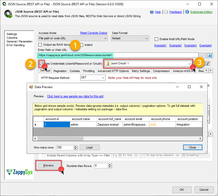 $.accountor$.computers). - Click Preview to see sample data from the Jamf Pro API.